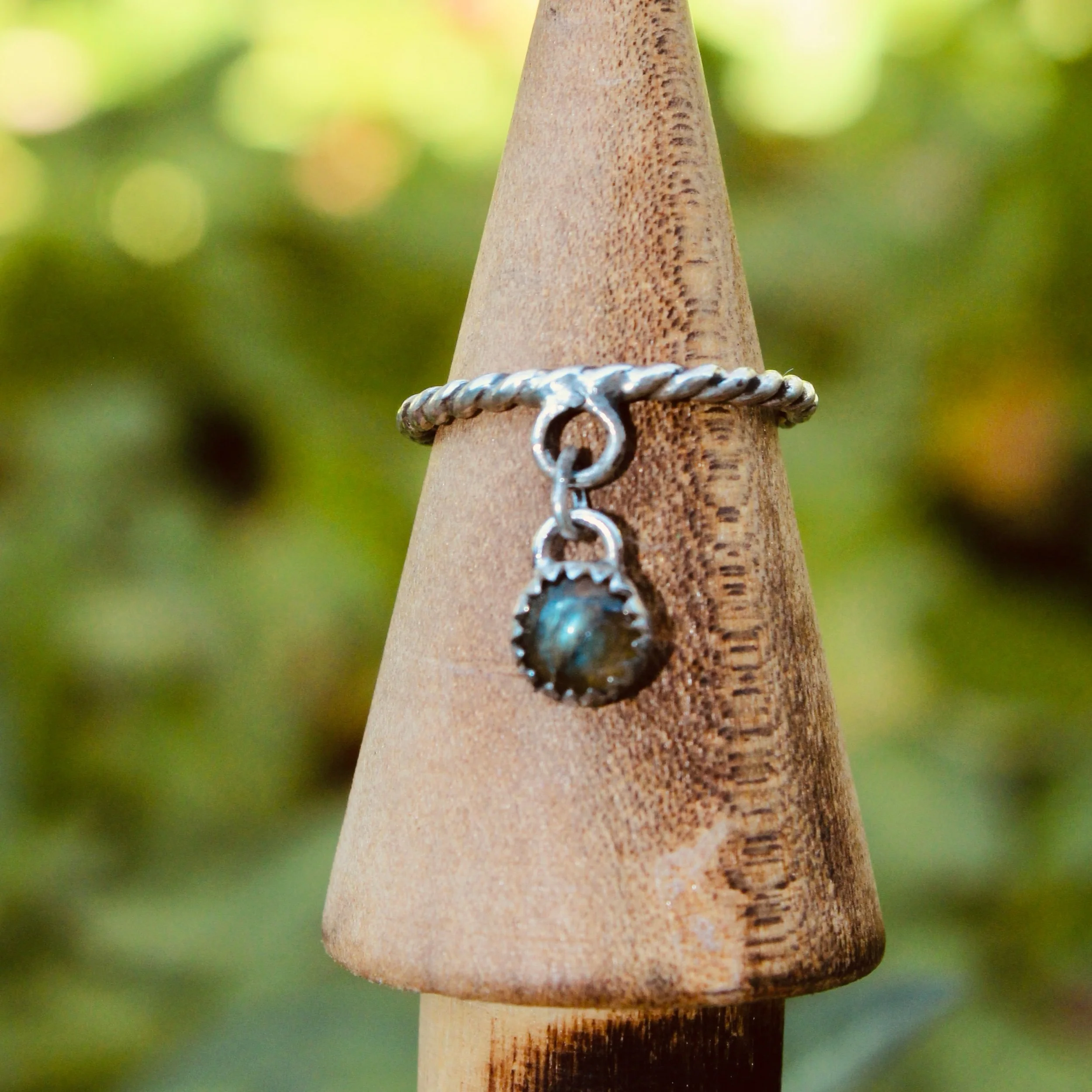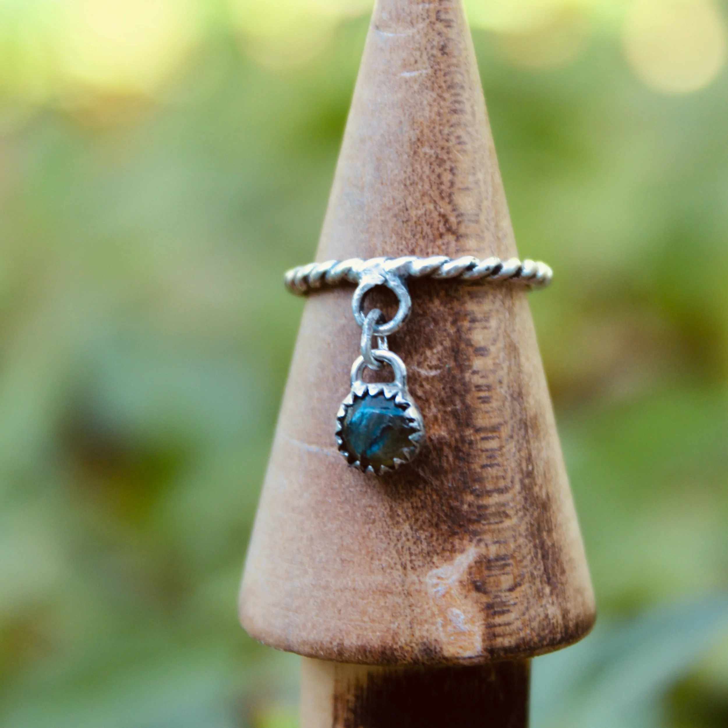 A captivating labradorite stone set in solid sterling silver, designed to be your forever ring. This piece features a softly dangling charm — soldered securely so it won’t come off easily, even with everyday wear.