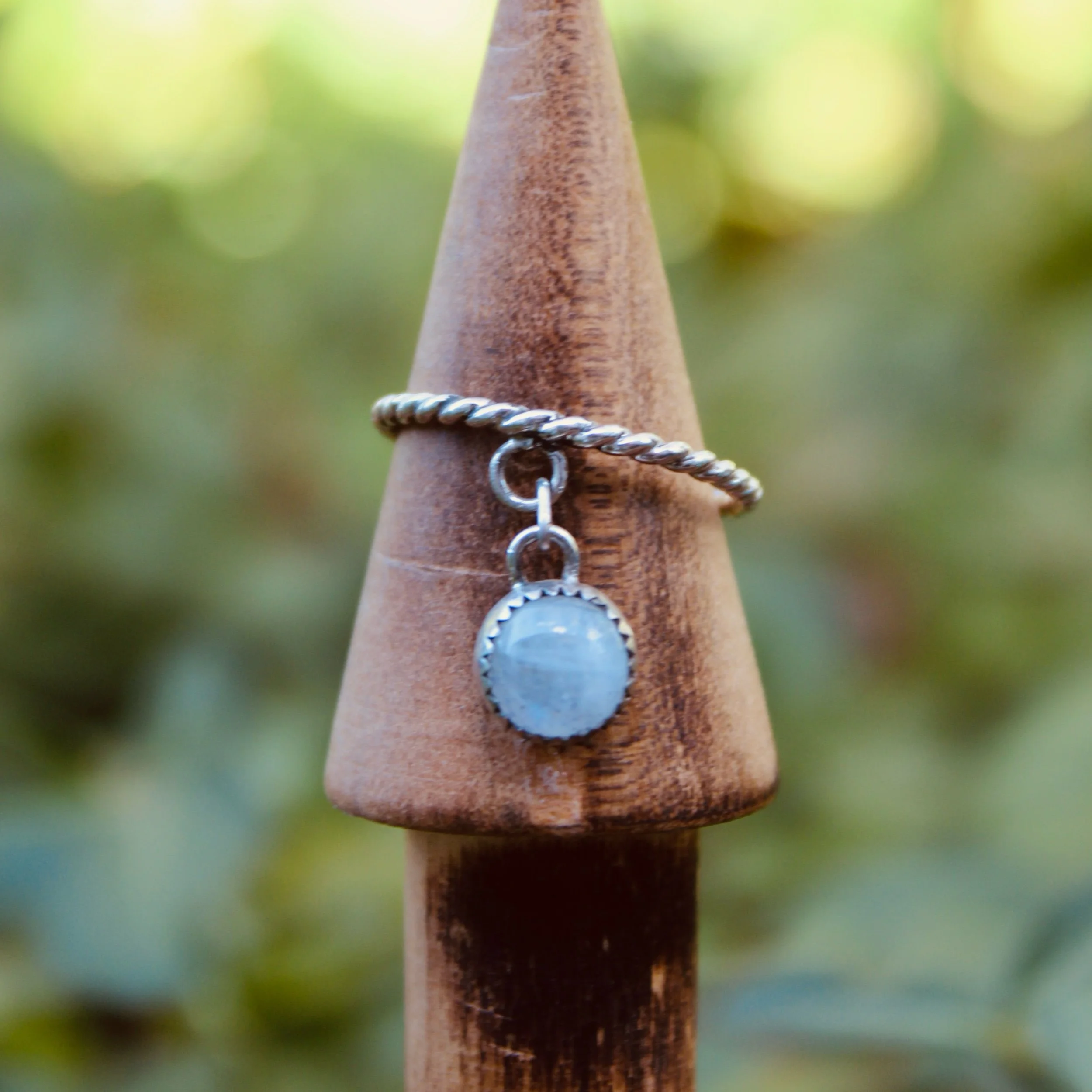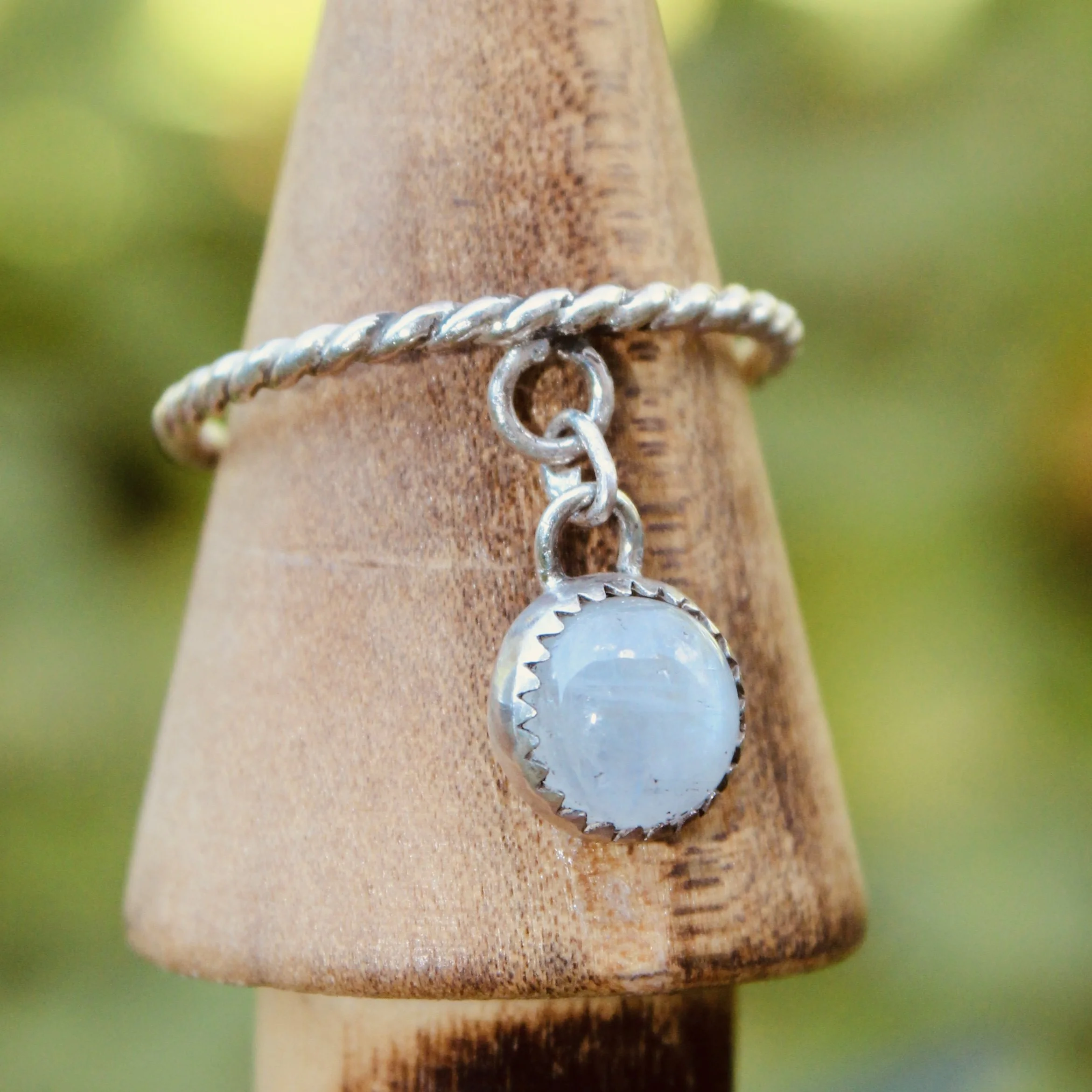A dreamy moonstone set in solid sterling silver, designed to be your forever ring. This piece features a delicately dangling charm — soldered securely so it won’t come off easily, even with everyday wear.