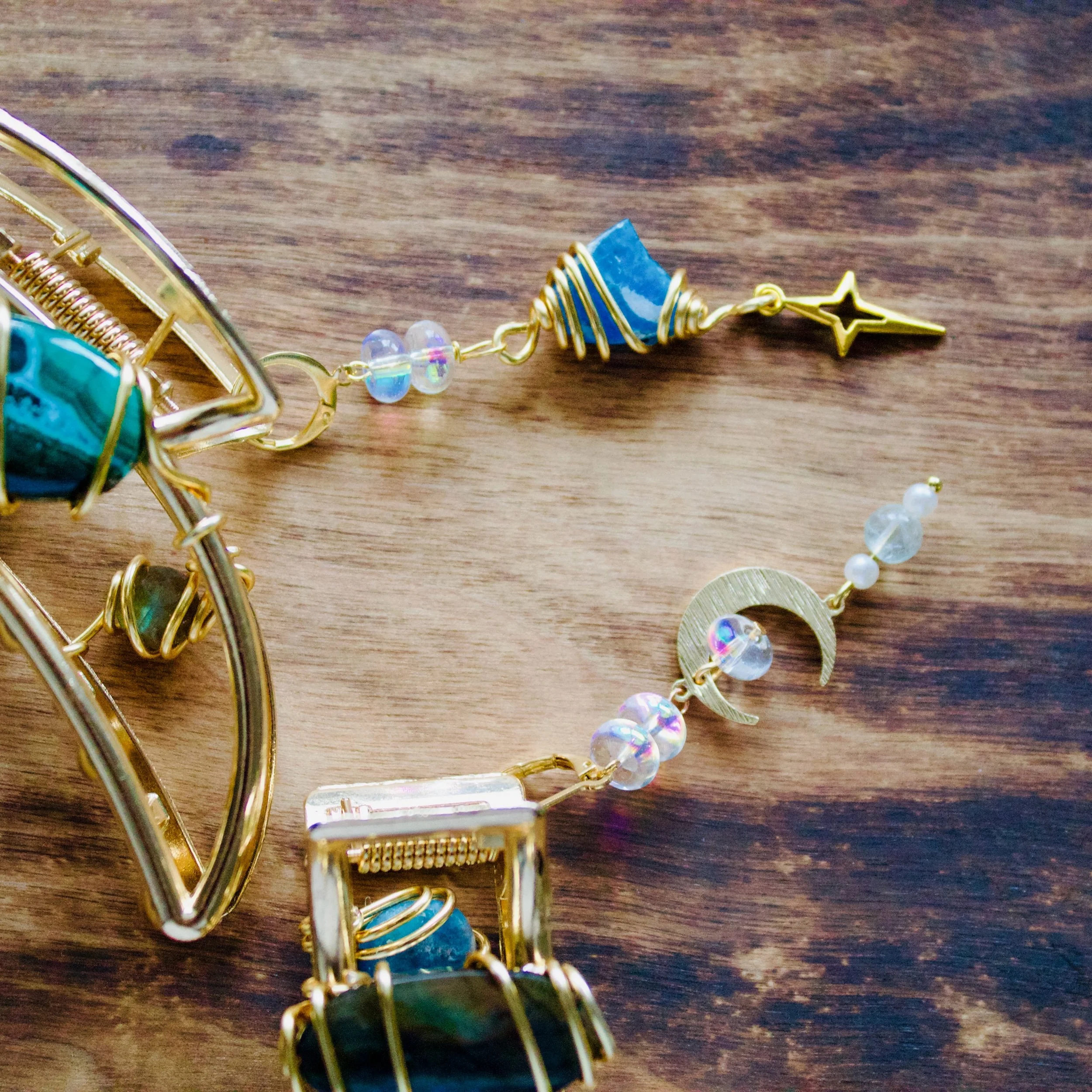 • A rectangular clip showcasing a combination of labradorite and blue apatite, creating a striking blend of depth and color, also finished with a removable dangly charm.
