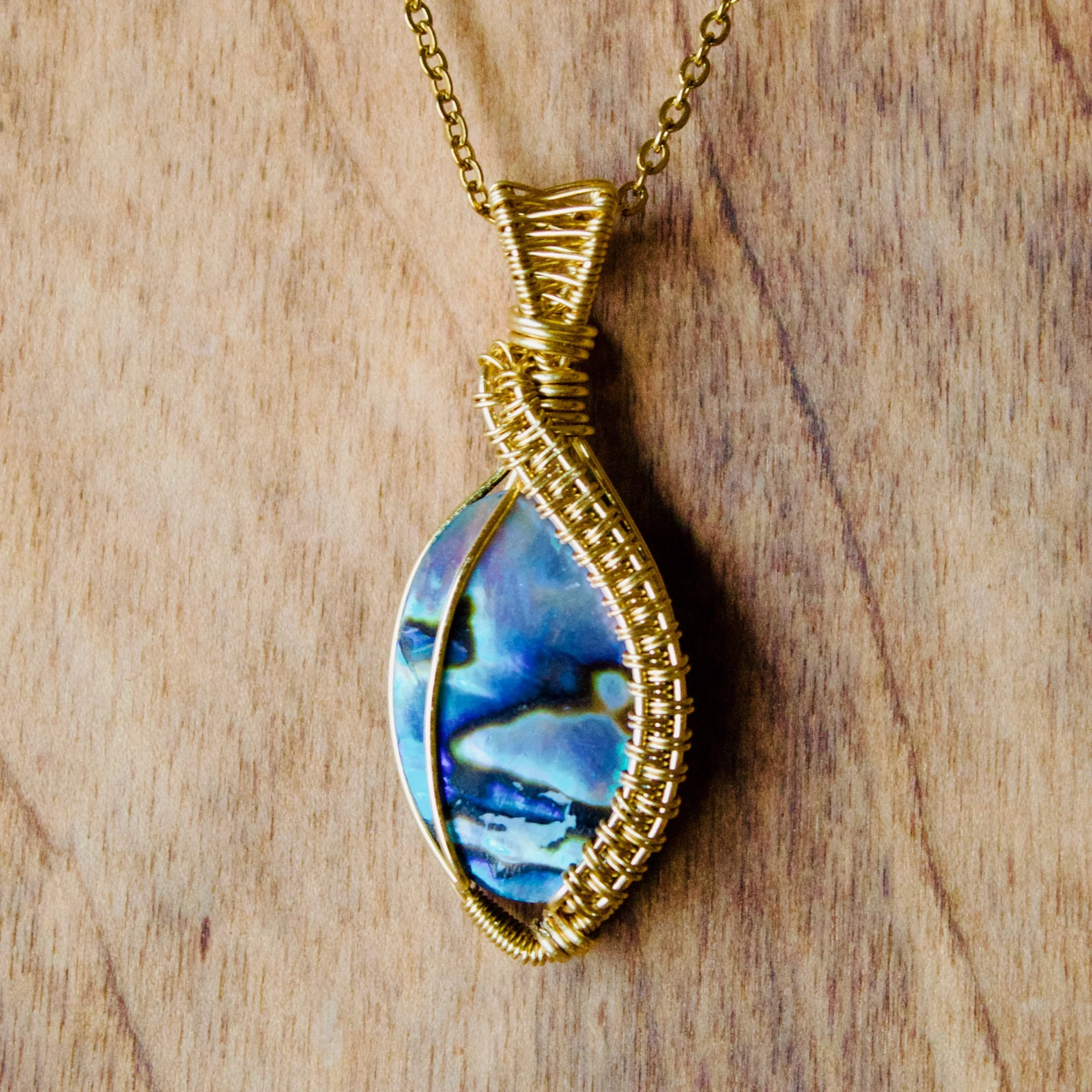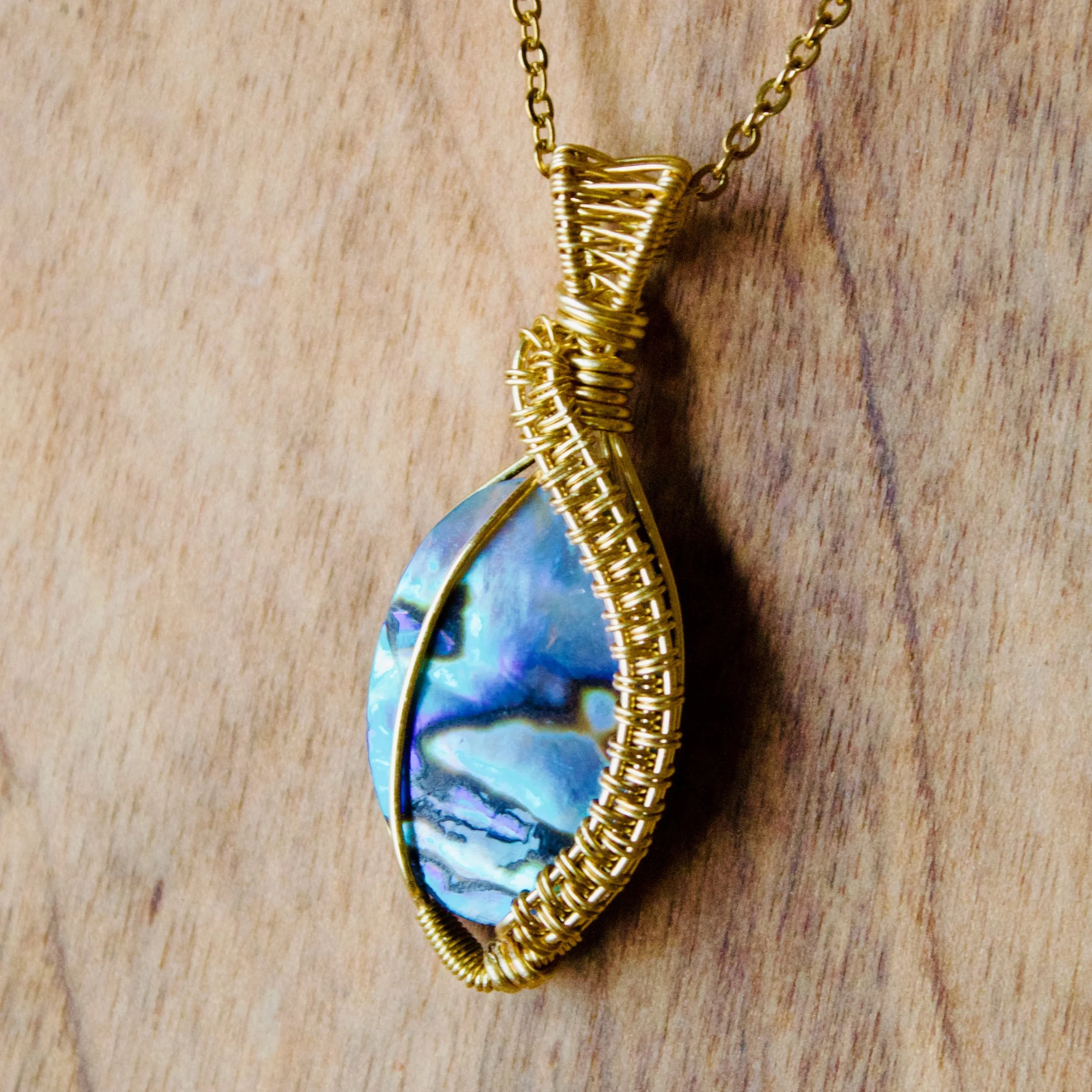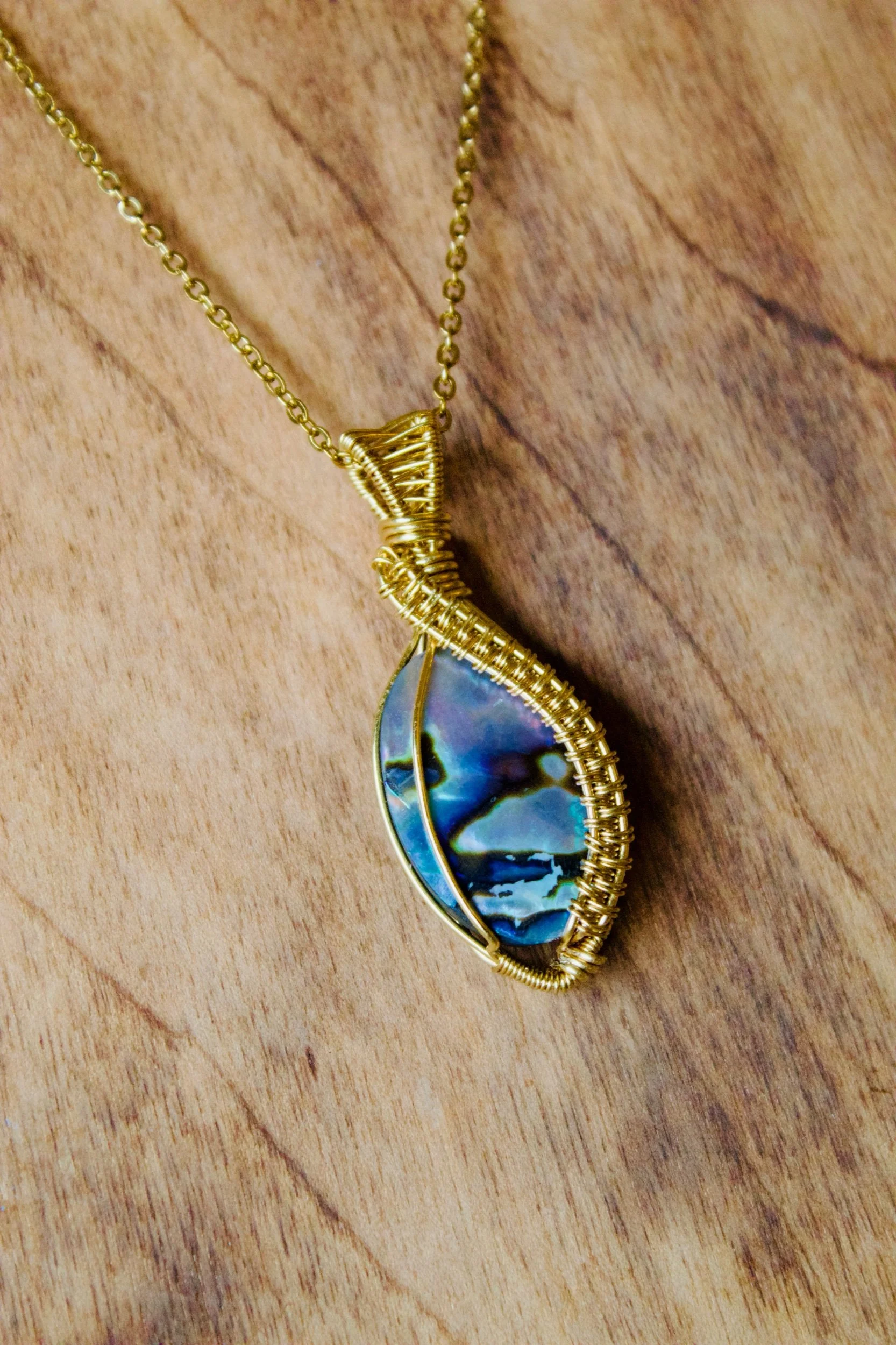 Wrapped in gold, this piece features an intricate woven design flowing down the side of the shell — adding texture, detail, and a handcrafted elegance that elevates the natural beauty of the stone. The weaving gives the pendant movement and dimension, making it just as stunning up close as it is from afar.