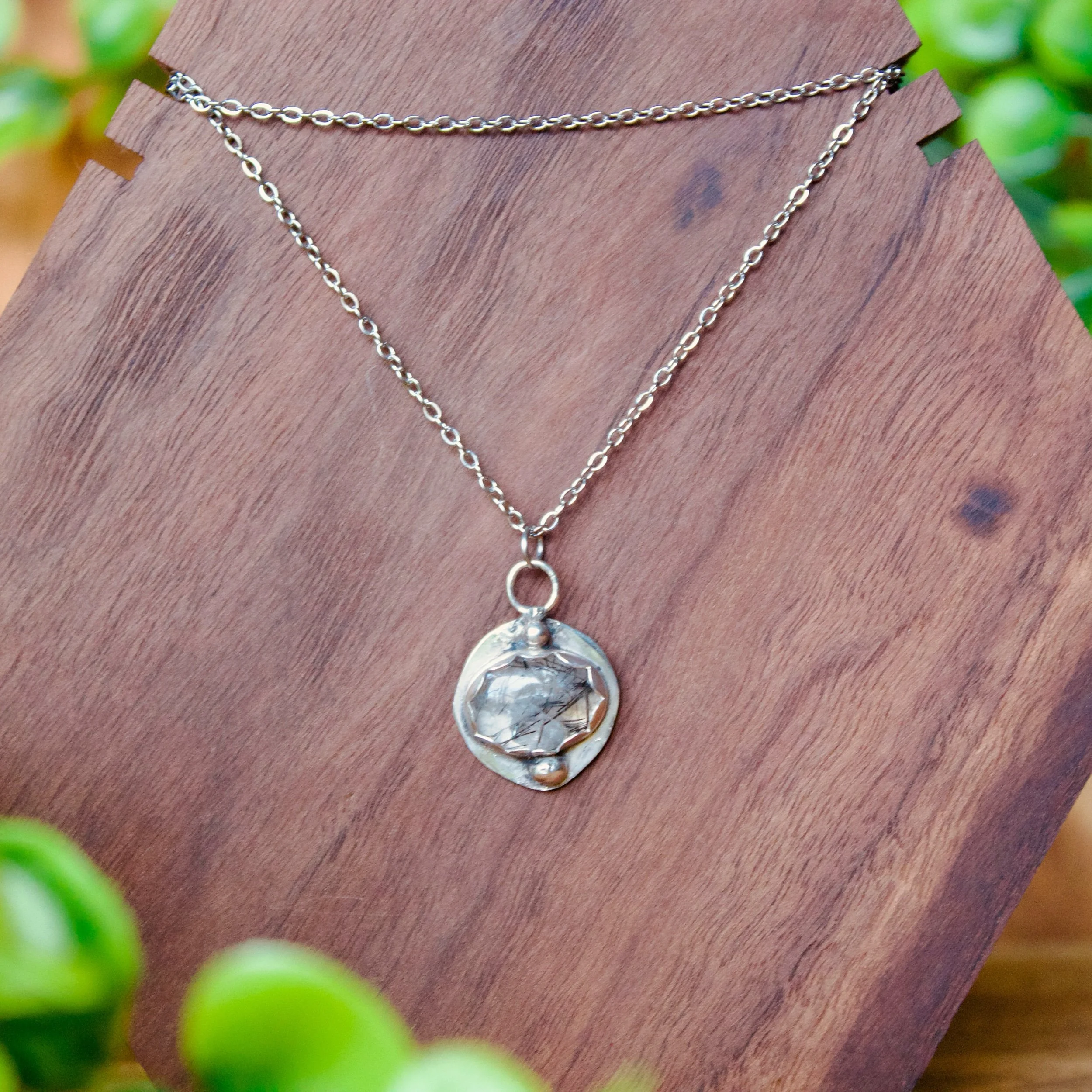 This striking sterling silver pendant features a mesmerizing tourmalated quartz, where delicate black tourmaline strands run naturally through clear quartz — like ink suspended in glass. Each inclusion is completely unique, making this piece impossible to replicate.