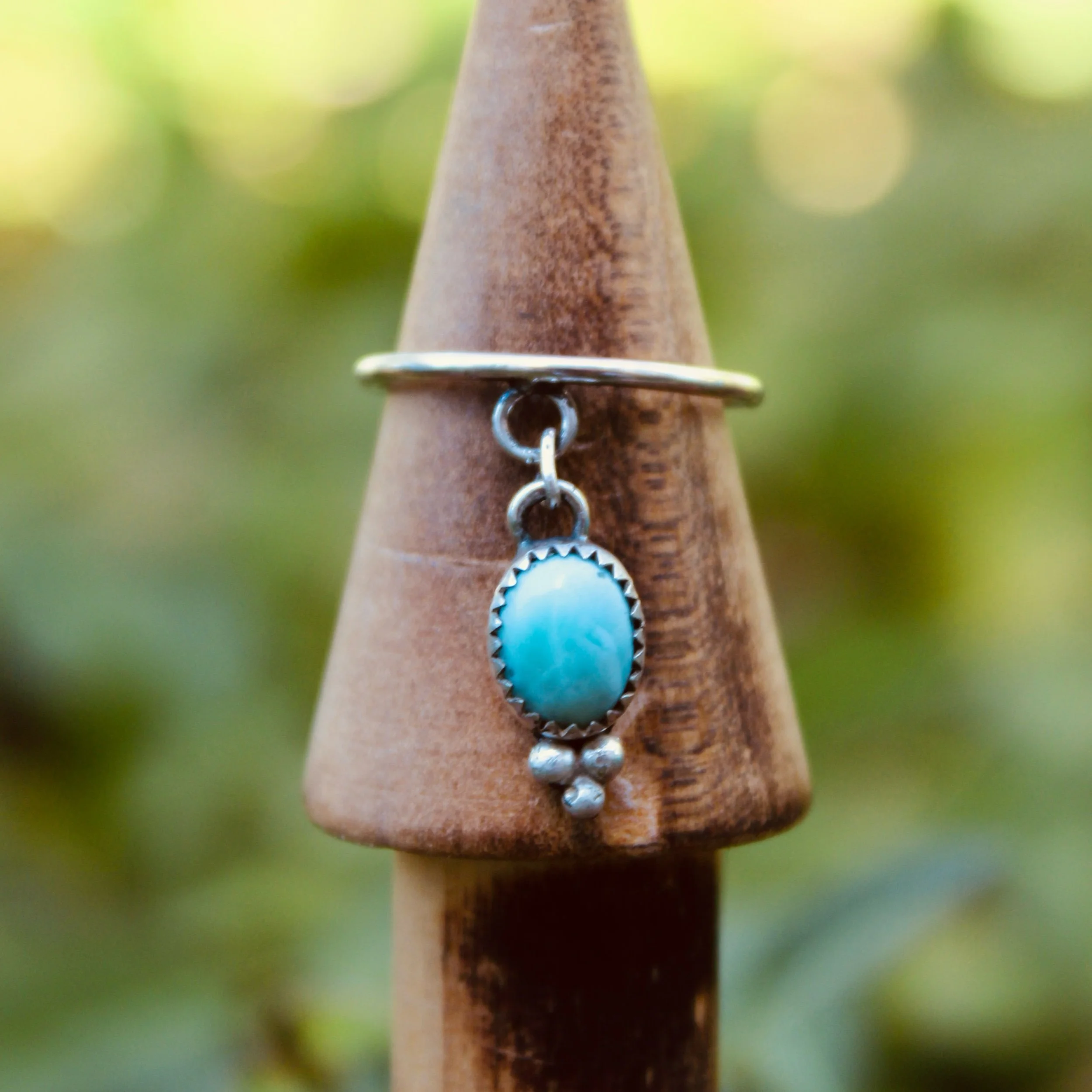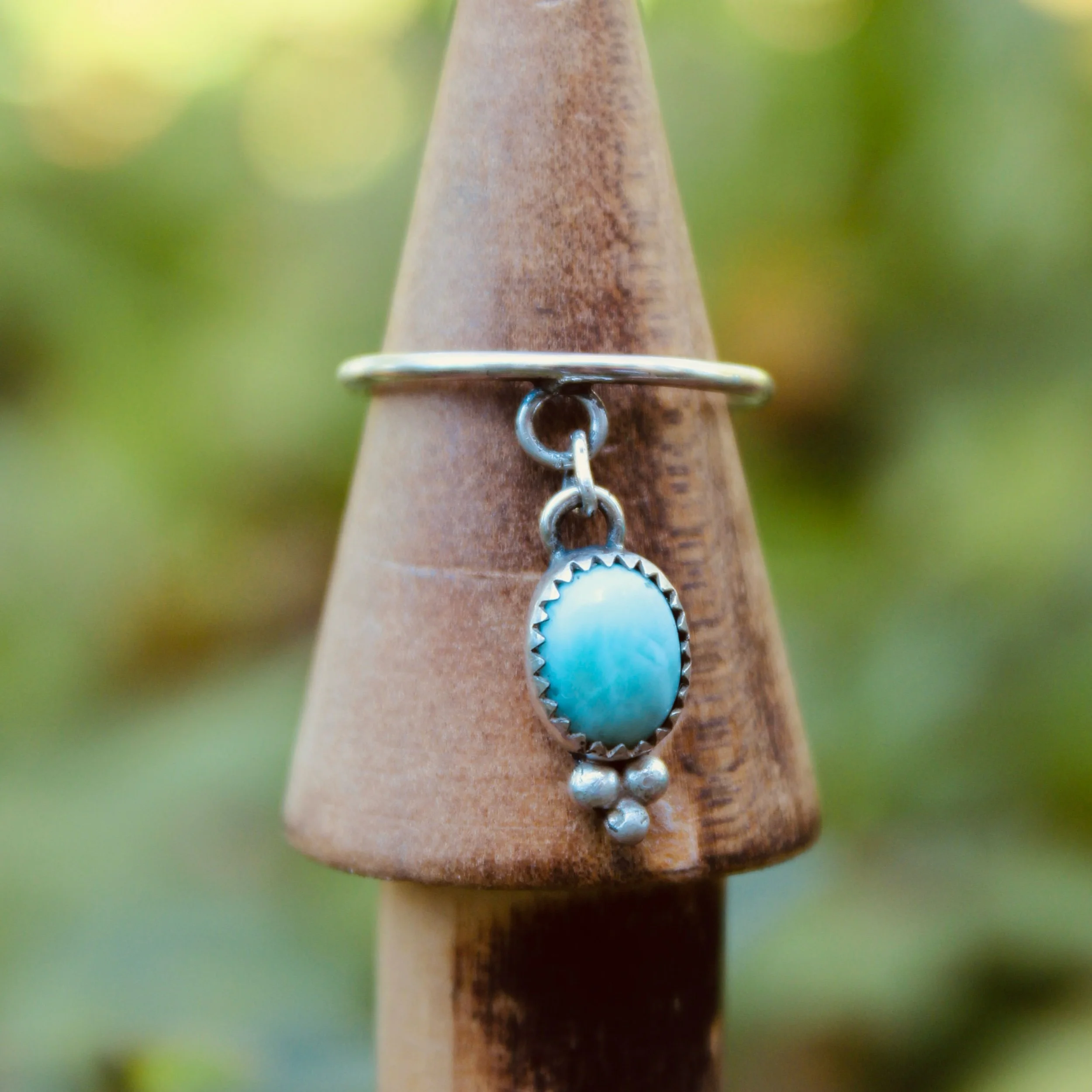 A serene Larimar stone set in solid sterling silver, made to be your forever ring. This piece features a dainty dangling charm — soldered securely so it won’t come off easily, even with everyday wear.