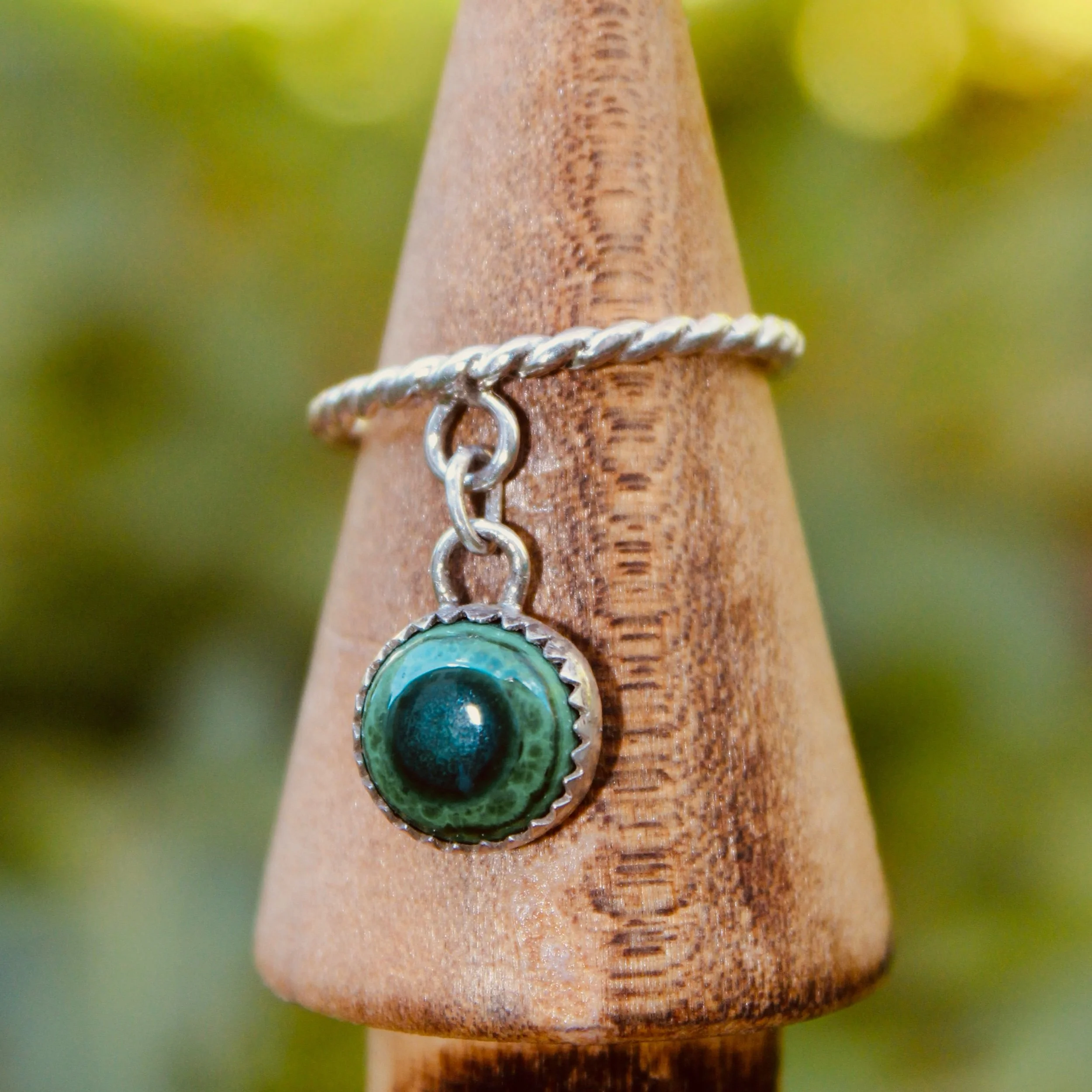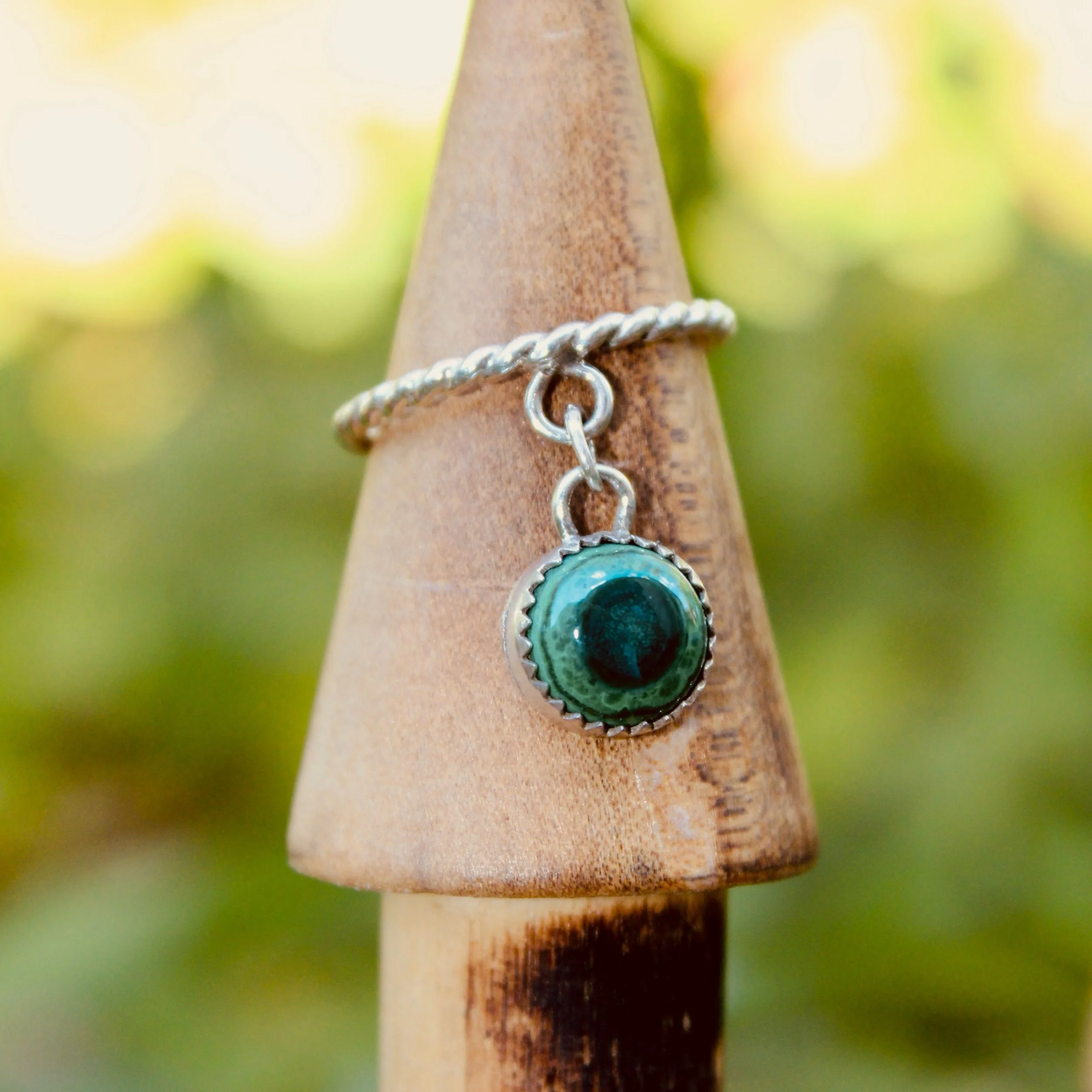 A rich green malachite stone set in solid sterling silver, crafted to be your forever ring. This design features a small dangling charm — soldered securely so it won’t come off easily, even with daily wear.
