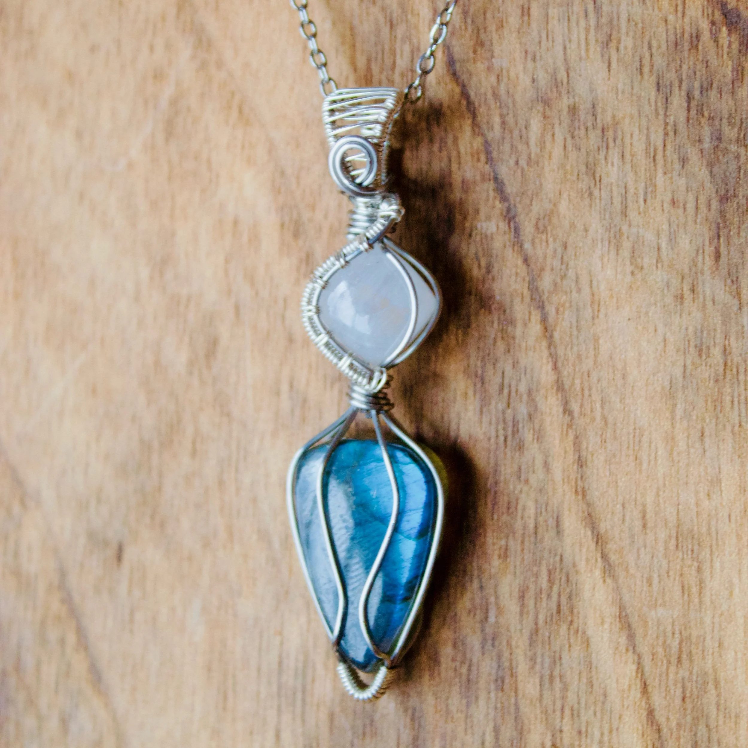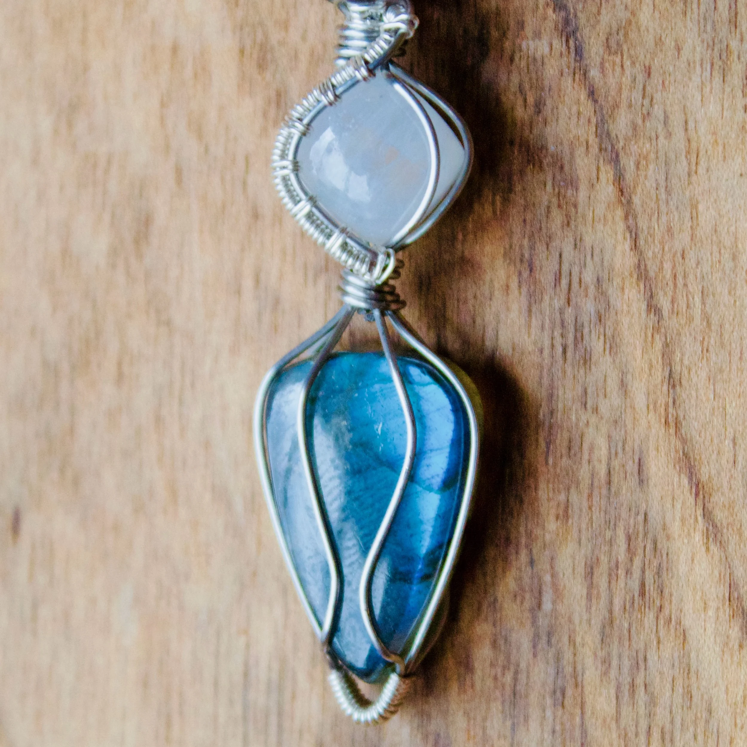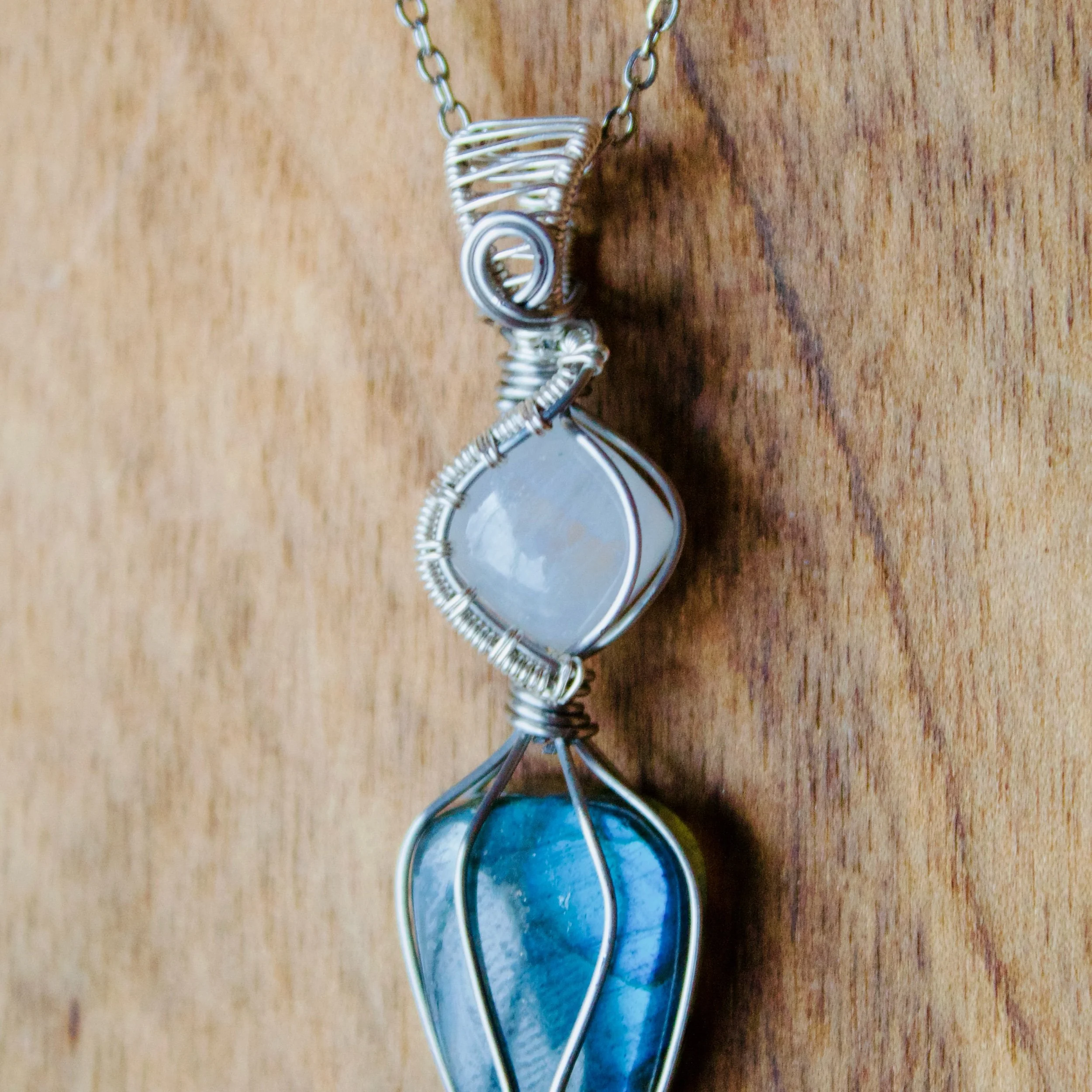 “Horizon” is a long, elegant silver pendant that feels like the meeting point between earth and sky. A luminous labradorite rests at the bottom, flashing shades of blue and green, while a soft, ethereal moonstone sits at the top, glowing gently with every movement. Together, they create a pendant that is mystical, balanced, and timeless.